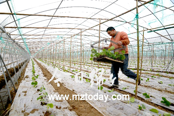 在新市镇长宁村4组的大棚里,一名管理人员正在搬运移植的瓜苗。为防御春寒影响,该蔬菜种植基地的业主采取温室育苗、搭建大棚和覆盖地膜等现代科技春育瓜苗,确保瓜苗抗寒保春种。