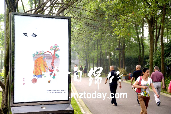 本刊消息 为了让市民在休闲游玩之时,潜移默化地受到社会主义核心价值观的影响,近日,我市人民公园制作、安装了多组反映社会主义核心价值观24字方针的绵竹年画公益广告灯箱,供人们欣赏。图为灯箱外观。