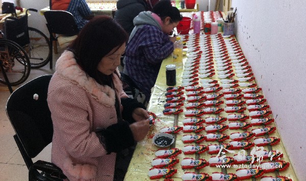 上午8:40,记者来到市残疾人康复中心,在一间几十平方米的房间里,55岁的李晓平正专心致志地进行着脸谱彩绘。“脸谱彩绘就是将规定的色彩填涂到脸谱模具上,看似简单,但是这一笔一线条,转弯或是直线,都不容易,需要极大的耐心。”在彩绘完六个脸谱后,李晓平用手揉了揉眼睛。“年纪越来越大了,眼睛也不好用了……”话毕,她又继续着手上的工作。环顾四周,这个小小的房间里还有不少忙碌着的残疾人朋友。