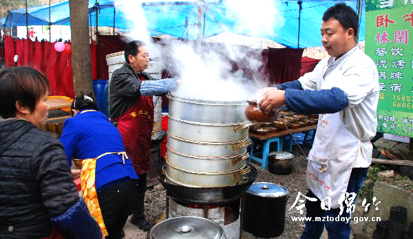 “正月十二你有空吗?”“年前就跟人订好了。”“那正月十三呢?”“一直到正月十五都有人订了,真不好意思啊……”2月27日,土门镇天宝村王大哥家办喜事,请来当地乡村厨师董涛操刀,这是记者在席间听到董涛与客户的一段对话。 春节期间,为图轻松自在,不少农村家庭都喜欢请来乡村厨师办几桌坝坝宴,招待亲朋好友,“乡村宴席”厨师自然也变得分外紧俏。怀着对这份职业的好奇,记者跟随土门镇罗荣村的乡村厨师董涛走进王大哥的喜宴,见证他与柴米油盐相伴的一天生活。 正月初九这一天,天刚蒙蒙亮,董涛就从家里出发,与工人们一起赶往王大哥家。6点左右,他来到头天搭好的简易厨房里,点火烧水,开始动手准备中午要用的食材。而其他工人也没闲着,都忙着洗菜、切菜、洗碗筷,分工有序。 烧牛肉、油爆螃蟹、白灼虾……一样样菜肴被安排得井井有条。放油、爆炒蒜头、倒下材料,放盐、烧酒、酱油……只听油锅里发出“吱吱”的响声,董涛拿起大锅铲使劲翻炒,一副驾轻就熟的样子。“正月里特别忙,从年初一到十五都排满了。”据董涛介绍,这几年生活条件好了,农村里对摆酒席也越来越讲究了。以前只有鸡鸭鱼肉,现在还增加了一些冷盘菜和糕点,不仅增添了菜式,还提升了酒席的档次。 中午11点40分,“噼里啪啦”的鞭炮声响起,接亲的车队陆续到达,客人们相继入座。“拿盘子过来,先上蒸菜。”董涛忙着把菜端出笼,其他人则端菜、上菜。土豆烧鸭、炒海参、板栗烧鸡……随后,一道道美味佳肴从董涛手中接连出锅,色香味俱全。尽管天气寒冷,但在厨房里忙碌的董涛却是满头大汗……这样的情景一直持续到餐桌上的菜上齐,客人酒足饭饱后,董涛和他的工人们才围坐在餐桌旁开始用午饭。“今年中午一共做了20桌,每桌有26个菜。”谈及一上午的劳动成果,董涛乐呵呵地说。 午饭后,董涛来不及休息,开着车赶往下一家,忙着准备第二天要举办的酒席。下午5点左右,董涛赶回王大哥家。“晚上的宴席比较简单,客人也比中午少了很多,中午的菜热过后就能重新上桌了。”董涛边忙边告诉记者。 简单吃过晚饭后,董涛和工人们又忙着将收拾好的锅碗餐具搬上车。“现在上门操办酒席,买菜、做菜、洗碗等一切事务都由我们厨师包揽。每接下一单生意,我和工人们头天就开始忙活,客人吃完后还得收拾桌子,为客户提供‘一条龙’服务。等会儿,我们就要赶往下一家,为明天的宴席做准备了。”说完,董涛手脚麻利地将锅碗餐具等运往第二天的酒席举办地。