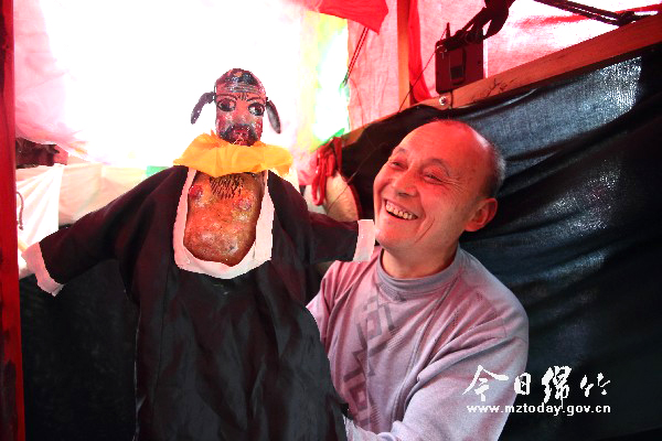 陈远立的被单戏吸引了很多赶场的村民前来观看 考虑到一个人操作方便,以前的台幕只有0.9平方米的空间,如今也就只有1平方米。“空间太大一个人无法完成所有动作,但是空间小了里面非常闷。”陈远立每次在表演时都穿得非常单薄,因为这也是一项体力活,有时冬天都要出一身汗,夏天则更是炎热无比。 “以前没有音响,表演全靠嗓子喊,非常伤身体,现如今有一些现代设备辅助,相比以前好了不少。”陈远立说,被单戏这门技艺不仅要会演,还要会自己做道具。他的道具木偶全都是自己做出来的,包括画脸谱,给木偶做头发、缝衣服帽子、做发饰耳环等等。 后继无人是陈远立目前面临的最大难题。“师傅临死前交代我千万要将被单戏传承下去,我不能让这门艺术在我手中断了。”陈远立说,曾经他走乡串户表演时,也教过一些弟子,可这些弟子都离他而去,多年来,再也没人愿意跟着他学。