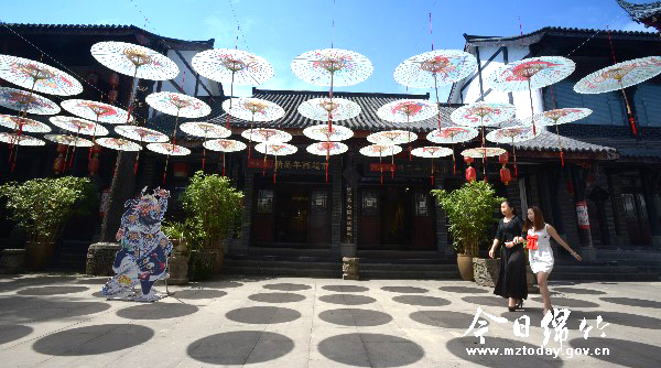 本刊消息 9月6日,记者在剑南老街看到,近百把悬挂的油纸伞像一朵朵五彩缤纷的花朵盛放,映衬着老街两旁仿古的街房建筑以及头顶的蓝天白云,更显得剑南老街古色古香。过往游人经过,纷纷拍照留念。 记者看到,油纸伞伞面是传统的绵竹年画娃娃,还有诚信、友爱等社会主义核心价值观年画图样,伞柄下缀着大红的中国结,一把把油纸伞有序排列一起,看起来美不胜收。 据了解,这些油纸伞是四汇斋年画公司在泸州油纸伞厂订做而成。该公司将把这些油纸伞长期悬挂于剑南老街街口,形成一道特别的景观,以供游客观赏。