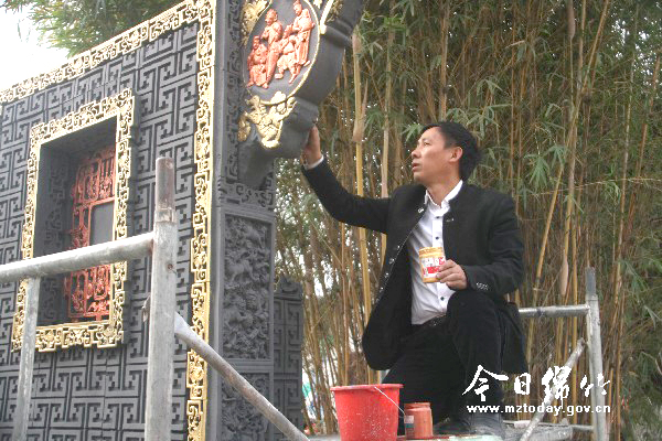 11月10日,在孝德镇年画村集中居住点,林代辉正带领几个徒弟进行年画景观墙创作,一旁的工人们也忙着铺设陶版年画砖。“绵竹年画元素植入新农村建设,让年画村更显古朴、自然。”林代辉一边忙活一边对记者说,年画景观墙是年画村文化主题景观的一部分,墙体用陶版年画砖砌而成,砖上则绘有童子送福等各种传统绵竹年画图。建成后,将使年画村更显文化韵味和独特风格。 ◆将绵竹年画与陶艺相结合 早在艺术学院求学时期,林代辉就曾涉猎版画、雕塑等多个领域,尤其喜欢陶艺。上世纪九十年代末,他还在绵竹开设了陶艺馆。在对绵竹年画有了深入了解后,林代辉便萌生了将绵竹年画与陶艺相结合的想法,经过长期研制,他成功创作了陶版年画,并申报了国家专利。从那时起,他便全心投入到陶版年画的研发创作工作中。 一开始,林代辉的陶版年画产品大多是工艺艺术类,销售效果不甚理想。如何才能让陶版年画更贴近生活,拥有更广阔的市场和空间呢?这成了林代辉苦苦思索的问题。直到2007年他在深圳考察时,看到当地人将艺术与建筑产品结合,这让林代辉大受启发,他随即又辗转前往苏州、山西等地学习,研发陶版年画砖的想法也日渐成熟。 回到四川后,林代辉便搭建砖窑,开始尝试制作生产陶版年画砖。经过一次次试验,最终获得了成功,并申报了陶版年画砖雕专利技术。在灾后重建时期,林代辉的陶版年画砖也深受欢迎,被大量运用在我市的乡村特色建筑中,其2009年营业额更达40余万。 ◆让年画艺术更贴近生活 “要根据市场需求来调整发展方向,传统民间艺术也要迎合现代人的审美情趣。”林代辉告诉记者,艺术最终也是为生活服务的。时代在发展,现代人的审美观念、家居装饰等都在改变,要传承绵竹年画,就要守住绵竹年画的灵魂,只有通过不断创新,增加年画的存在形态,让老百姓随时都能够触摸到它,才能让这一古老艺术保持长青。 林代辉积极创新绵竹年画载体的行为,深受各级领导赞赏。日前,四川省委书记王东明来到年画村后,对他的年画砖雕赞不绝口。同时记者也了解到,除了年画砖雕技术外,近年来林代辉还将陶版年画与我市白酒产业结合,设计的“酒乡画城”陶版年画酒瓶深受市场欢迎,目前已与剑南春集团建立了合作关系。 “下一步要把年画砖雕更广泛地应用到新农村建设中。”林代辉指着正在打造的年画景观对记者说,目前年画景观墙已基本成形,年画砖道路也已铺设了200米,预计春节前就能全部竣工。今后他还将加大推广力度,让造型古朴、实用性强的年画砖雕更广泛地运用到新农村建设中,让年画艺术走进千家万户的日常生活。