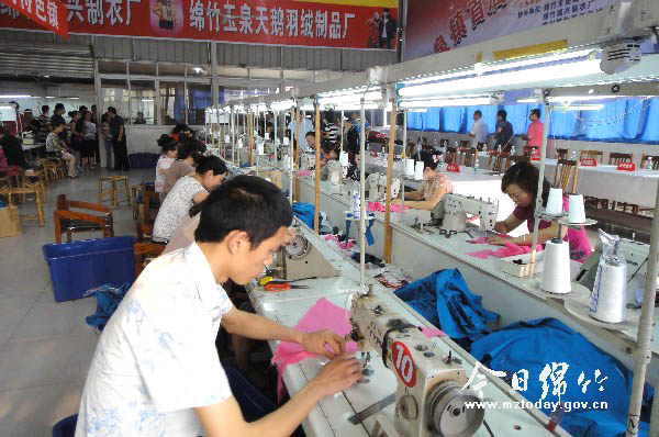 ●不断发展壮大的羽绒制衣产业 羽绒制衣产业是我市极具发展潜力的传统特色产业。在近30年的历程中,我市羽绒制衣产业经历了盛极一时到低迷,到再度兴起,不断发展壮大的过程。目前全市以玉泉为主,什地、广济等六个镇拥有绵竹楚峰羽绒有限责任公司、旭阳冉冉家纺有限公司、晨光制衣有限公司等28家羽绒服装企业,拥有自主品牌的企业5家,代加工户600余户,从业技术工人5000多人。2015年实现产值3.5亿元、销售收入近3亿元、利润2000万元、税收3000万元,生产水洗羽绒380吨,羽绒服及制品200万件(套)、羽绒服装核心企业带动发展农户协作加工点20余个,解决就业2000人,生产企业带动养殖农户500余户,带动鸭鹅养殖40万只。 同时,我市从事羽绒服装订做的家庭经营户已发展到1000多户,订做市场拓展到北京、重庆、内蒙古、青海、新疆等地的全国数十个省、市、自治区,年生产羽绒制品逾200万件。“泉鹅”、“千仞雪”、“晨光”、“旭阳冉冉”等自主品牌也为市场所认同。同时,这些企业还与皮尔卡丹等世界知名服装企业建立了长期紧密的合作关系。 ●多项产业政策助推发展 羽绒制衣产业的发展壮大,离不开产业政策的扶持,也与其良好的产业、市场、劳动力和市场发展基础密不可分。 记者了解到,“十二五”期间,我市在产业规划中鼓励以“畜禽良种化,养殖设施化,生产规范化,防疫制度化,粪污处理无害化和监管常态化”为内容,建设标准化、规模化、特色化的绵竹优质小家禽畜生产基地,启动川西羽绒特色镇建设以推进新型城镇化进程。同时,按照强基础、上规模、拓市场、创名牌的发展战略,引导企业积极加入,鼓励订做户积极合作,从而形成以原辅料生产为基础,加工产品为补充,企业自主生产为主体,外贸销售为一体的羽绒制品区域专业市场。