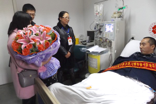 2月26日上午9时50分,四川省人民医院细胞采集室内,在妻子黎晓静和儿子的陪同下,我市第六例造血干细胞捐献志愿者程琳安安静静躺在采集床上。一旁,血细胞分离机正在不停运转,并不时因进液压力过低而发出警报。 “刚开始时我的血流量较慢,仪器不时发出警报,感觉有些紧张。”程琳说,刚开始的造血干细胞采集过程并不是很顺利,担心无法顺利完成采集,他一直紧张地握着拳头。 血脉相融,从此我又多了一个江苏女儿 程琳是什邡师古人,在我市碗筷六香中餐馆工作。受绵竹人感恩情怀的影响,2010年程琳成为一名造血干细胞入库志愿者。程琳告诉记者,在绵竹工作4年多的他,已将这里视为自己的“第二故乡”。正是江苏亲人的无私大爱,让“家乡”绵竹历经5·12灾难后涅槃重生。当得知自己与一名江苏小女孩配型成功后,程琳分外激动。 “造血干细胞移植后,她的身体里会流淌着你的血液,你们是真正有了‘血缘关系’。”在采集过程中,一直守护在他身边的中华骨髓库四川分库的工作人员与程琳聊天解闷,对于自己有了一位“血缘关系”的女儿,程琳乐得合不拢嘴。“我就希望她能够尽快好起来,然后快乐、健康地成长。” 爱心接力,为小女孩送去救命血 当天中午12时许,两个多小时躺在采集床上一动不敢动,程琳的四肢有些僵硬,人也显得有些困倦。此时5岁的儿子走到爸爸身边,有模有样地给爸爸轻轻按摩起来,妻子也一直守在身边不时地嘘寒问暖,这一幕画面温馨而感人。 程琳说,自己能够躺在这里完成采集,背后凝聚着太多人的支持和帮助。 2月22日,绵竹市红十字会工作人员一路护送他到成都,与中华骨髓库四川分库工作人员安排好他的饮食起居。“每天打动员剂只要几分钟的时间,可是工作人员却得挤几个小时的公交车特意赶来陪护。”程琳说,他还有幸去到中华骨髓库四川分库参观,与工作人员一起度过了一个特别温馨的元宵佳节。而在采集过程中,工作人员更是全程陪着他,还特意为他准备了牛奶、面包等补充营养。 这一次捐献,程琳特意为儿子请了假,带他一起来参与捐献,希望从小就培养他感恩、奉献的精神,而儿子这段时间也懂事了许多,让他感到欣慰。“特别是妻子黎晓静,一直给予我鼓励和支持”。 当天下午2点10分左右,经过4个多小时,31个外周血循环,医生从程琳身体里顺利采集出187毫克造血干细胞悬液,工作人员立即赶赴机场,交到江苏医生手中,送往苏州,拯救7岁女孩的生命。 记者从中华骨髓库四川分库获悉,程琳是我市第六例、四川省第98例造血干细胞捐献志愿者。而截至目前,我市又有2名入库自愿者精配成功,有望在3月完成采集和捐献。