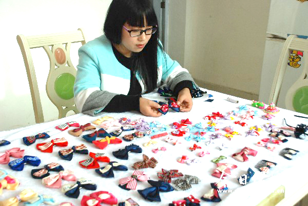 发夹、发箍等精美发饰是很多爱美女性的最爱,而纯手工制作的发饰更是让人爱不释手。家住西南镇飞凫村,今年24岁的陈瑶,是一位2岁女孩的妈妈。她为了陪伴女儿,选择一边在家带孩子,一边做手工饰品,实现在家就业增收的梦想。 在手工饰品制作中找到乐趣 3月12日上午,记者来到陈瑶的家中看到,在客厅一角,陈瑶正在专注地制作发夹。缠绕、翻折、整理、定型,短短几分钟时间,一个漂亮的蝴蝶结发夹便跃然眼前。而一旁,整齐地摆放着陈瑶闲暇时制作的各种精美发饰。 娴熟的技艺,漂亮的成品,让人很难想象陈瑶在一年前还对手工活一窍不通。谈及为何对手工饰品产生兴趣,陈瑶说这还得谢谢她的小侄女。“去年暑假,小侄女到我家来玩,看到她一头乌黑的头发很漂亮,但总感觉少了点什么,于是便尝试给她做了两个可爱的发夹戴在头上。”陈瑶说,刚开始自己什么都不会做,于是便请教了有手工经验的姐姐。在姐姐的帮助下,她从简单的绕线、上胶、固定开始练习,短短2天时间,陈瑶便学会了发夹制作的工艺和手法。当小侄女戴上自己亲手制作的漂亮发夹时,成功的喜悦油然而生。于是,她决定在家制作手工饰品实现自己的创业梦想。 从手工饰品制作中结识更多朋友 于是,陈瑶便开始着手准备,她购买了很多制作手工发夹的原材料进行学习和尝试,并根据自己平日的积累和观察,不断对发夹样式进行大胆创新。为了提高技艺,她还将自己以往买的发饰进行加工改造。从小女孩的简单发夹,到一个个时尚新颖的发带和发箍,心灵手巧、颇有悟性的陈瑶,很快摸索出了各种小饰品的制作经验,做出的漂亮饰品赢得了家人和朋友的啧啧赞叹。“我将成品发到朋友圈后,大家反响不错,还有不少朋友通过微信红包将我的手工饰品全部买走了。”看到自己制作的饰品如此受欢迎,陈瑶便尝试着将做好的饰品拿到街上售卖,没想到销量不错,有的顾客甚至多方打听来到陈瑶家中,希望陈瑶能给自己私人定制一款独一无二的发夹。渐渐地,陈瑶和这些喜爱她手工饰品的顾客们成为了无话不谈的好朋友。 一直在家带孩子的陈瑶以前生活圈子很小,自从开始制作并销售手工发夹,陈瑶便逐渐找回了遗失的生活圈子,日子过得充实而快乐。“我会一直坚持做下去,让更多的人能够喜欢我的手工饰品,也希望能够结交更多的好朋友。”在陈瑶看来,如果有一天,她能够凭借自己灵巧的双手,开一家专售手工饰品的实体店和网店,那么这小小发夹也能成就她创业的梦想。