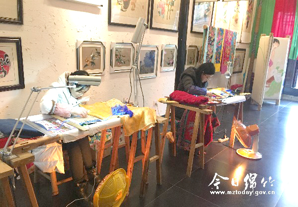本刊消息 每年年画节期间,我市各大年画商家都会迎来全年的销售高峰。日前,记者通过走访了解到,近段时间,各年画商家正在紧锣密鼓地赶制相关商品,以迎接今年年画节的到来。 1月10日下午,记者走访我市多家年画作坊,发现家家都忙得热火朝天。在剑南老街的康乾年画社,各式各样的年画绣品、展品、饰品摆满了柜台,古香古色的装饰显得别具一格。几盏大红灯笼下,年画艺人殷女士正在飞针走线忙着刺绣。“这是一幅观音图,专为客人准备的,不过需要花费的时间比较久。”殷女士告诉记者,按照惯例,年画节期间会有大量的市民和游客购置年画商品,因此他们早早地做好了准备。 下午3点,记者走近三彩画坊,只见各式各样的年画商品琳琅满目,几把油纸伞倒挂在房内随风轻转,别有一番风情。抬眼望去,有的年画艺人正在桌案前提笔作画,细心勾勒,均匀着色,不一会,一个个色彩丰富的年画人物便跃然纸上;有的年画艺人则静坐在绣桌前飞针走线,环顾画坊,每一个人都在紧张地忙碌着。 “今年年画节期间,我们准备了一系列丰富多彩的活动,就是希望游客能够多了解我们绵竹年画的文化历史。”三彩画坊负责人贾君告诉记者,为了迎接年画节的到来,他们从去年11月中旬就开始着手准备,经过大家的努力,目前店内准备了充足的年画商品和年画饰品,能满足顾客不同程度上的需求。而在年画节活动期间,游客可亲自尝试从拓片、彩绘到对产品附着的体验,比如在石头上、小蛋壳上画年画,现场体验刺绣年画的乐趣,游客还可以将自己的作品拿回家留作纪念。另外,位于年画村的三彩画坊已于去年11月开张,届时,游客们可前往该处购展品、喝咖啡、画年画等。