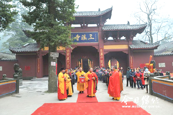 三溪寺,坐落于我市土门镇梅子沟,始建于北宋祥符年间,古名广安寺。当年的开山祖师玉川长老眼光不凡,将寺庙建在环山面湖、清流翠帐之间。寺周八景奇绝可爱,参天楠木、银杏浓荫蔽日,将古寺笼罩于青幽之中。 千古名寺 文人骚客纷至沓来 三溪寺建筑面积约9000平方米,寺内有弥勒殿、观音殿、大佛殿、祖师殿及僧舍客房等建筑。四川明代状元杨升庵的诗,描写三溪寺风光的主要特点是:“幽”和“胜”。寺前的巍石,寺侧的灵泉(三箭水)和湖水、松风,寥寥数笔勾勒出一幅引人入胜的山水画来。明代名士杨慎赋《三溪寺》诗:巍石山前寺,灵泉胜复幽。紫金诸佛相,白雪老僧头。潭水寒生月,松风夜带秋。蜀王三箭发,射水济民忧。四川名士乾隆翰林李调元也曾在三溪寺题诗。 据县志记载,三溪寺元代屡遭战火,至大三年庚戎(1370年)被毁。在历年维修以后,寺内除大佛殿外,其余建筑均为清代建筑,唯有大佛殿尚属明代建筑。据殿梁题款所记为明洪武十年(1377年)建。此殿距今已有610多年的历史。经省文管会古建筑专家现场查勘,认为此殿具有较高的历史价值和建筑艺术价值。为此,绵竹县人民政府于1985年6月将三溪寺列为县文物保护单位。1991年被列为德阳市级文物保护单位。经不断维修,寺庙建筑逐渐完善,佛像雕塑陆续恢复。 大佛殿两侧,至今仍保存二株传说为开山祖师亲手种植的桂树。一株为金桂,一株为银桂,树形奇特,姿态秀雅。传说为玉川祖师手折丹桂一枝,一撕两半,分别插入殿前两侧的土中成活。金桂开红花,银桂开白花。清代康熙邑令陆箕永曾为此景题联“两树桂花三溪水,四时烟雨半山云。”两株桂树历经六个世纪枝繁叶茂,吐翠飘香。 在观音殿两壁,至今尚存元代巴图鲁汉手书“龙虎”二字,字径5米,每字一笔挥成,似龙蛇卷曲,遒劲而苍古,蓄含龙腾虎跃之意。寺中有一株紫薇树,其一大一小的两个枝干连在一起,而树根分成两“根”长在地上,形成一道奇特的景观。这株古树2005年被绵竹市政府列入挂牌保护行列,也列入了国家级的保护古树名录。据悉,这株古树距今有450年的历史。每年7月下旬到8月中下旬,都会开出粉红色的花朵,吸引四面八方的游人前去观赏。 传说美景相映成趣 三溪寺三面环山,面湖而立,泉流曲绕,浓翠掩映,流传着不少优美的传说。寺周景点胜迹极多,如玩月犀、朝阳湖、卧牛湖、伏虎崖、潜龙洞、礼拜石、紫岩舍、石钟、石鼓等,为川西著名的旅游圣地。美丽的景点也与各种传说相应成趣。 狮子岩和蛰龙头:和三溪寺山门相对,百步之遥有一道起伏的山坡,坡高虽不逾丈,然而其形却似天然屏障,将寺庙建筑隐去。游人到寺前,尚不知寺在何处,待转过坡口,方得见庙宇,仿佛仙宫自天而降,可使游客疲乏顿消,陡增精神。坡口有几块巨石,形同雄狮威震路口,故名狮子岩。沿狮子岩前行百步,有一岩石凸出外约3米,其形状酷似龙头,大张巨口,仿佛刚从沉睡中醒来仰天长啸,游客见状莫不为大自然的鬼斧神工所倾倒。 三箭水和灵源桥碑记:沿寺门前道路上行,约500米处,有一名胜景点,名曰“三箭水”。这里清泉一泓,四时均有数股泉水自地下涌出,咚咚作响,宛如琴声。泉岸边立有一处斑驳的古碑,即有名的“灵原桥碑记”。此碑为明人弘治丁未年(1488年)12月所立,迄今已逾五百年之久,石碑碑文称:“绵邑之西四十里许,三溪山广安寺之左有神泉焉,四时不竭……适宋祥符肇建广安寺,相传以为蜀侯孟氏昶游此……疾涌三泉而射效之名始……。”从这残缺的碑文中不难看出五代蜀侯孟昶行军至绵竹,由于天旱,军士饥渴,孟昶乃连发三箭,射出潺潺泉水。此传说虽不可信,但该处泉水经专家化验,确属含锶低钠的优质矿泉水,可作多种饮料的水基。每当游人至此,无不在此畅饮甘泉。 困牛山和困牛湖:由三箭水再上行不远即到风光旖旎的困牛湖。当你立足湖堤,极目眺望那浩渺如镜的湖面以及那湖中势如卧牛的岛屿时,在天光云影的映照下自然会产生“山如翠黛眉峰蹙,水似秋波眼底清”的诗意来。 石钟和石鼓:在距狮象岩不远的山岩下有一巨大的岩石,人称石钟岩,岩下形成可容百人的洞穴。奇特的是进入洞口仰望洞顶自然形成一个口径约2米的凹坑,其形状酷似一口巨钟的内壁。用石敲击,咚咚作响。清初以来,就有不少文人雅士以此石钟为题作诗寄兴。和石钟岩遥遥相对的一个山岩形如巨鼓,称石鼓岩,敲之作鼓响之声,传说亦为玉川祖师将钟鼓安放在这两边山坡的遗迹。 除此之外,寺周尚有朝阳洞、红云洞、水帘洞、猴子岩、乌龟石、伏虎岩等种种胜迹,游人每到三溪寺景区观光,无不对此山川文物之美,钟灵毓秀之源,留连忘返,交口赞誉。
