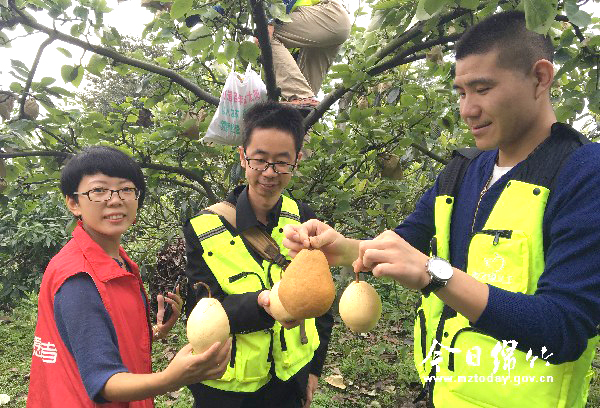 图为马文(左一)和志愿者一起帮助困难户摘梨