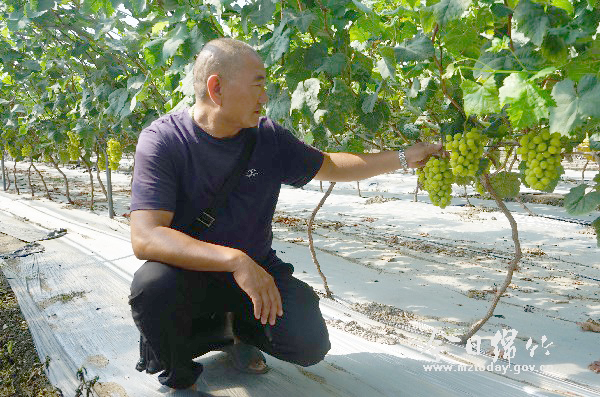 图为谢应强在种植园内查看葡萄长势