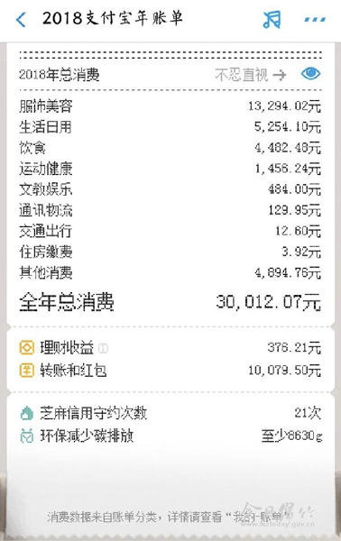 本刊消息 1月8日,2018年支付宝年账单正式发布,这一次年度账单以购物小票的方式统计了支付宝用户2018年的各种花销以及信用履约情况等。账单出炉后,不少市民在朋友圈内晒出了自己的消费情况,其中的隐藏功能、2019年的多个个性化的许愿标签更是引发了大家的热议。记者随机采访了几位消费者,从他们的支付宝账单中,可以看到2018年我市市民的生活状态。 热议:支付宝年度账单以小票形式出现 打开支付宝年度账单,记者发现,与之前的相比,支付宝在2018年账单上更加隐私和个性化。在入口方面,支付宝2018年个人账单只接受用户自主查询,只有自行在顶部搜索栏键入“年账单”或者打开支付宝-我的-账单功能,才能看到个人年账单。在账单开启页面,还需要额外的身份验证。用户只有通过刷脸、指纹、数字密码等方式完成验证,确保是本人查看才可以正式开启年度账单。 从账单页面风格来看,2018年度账单的风格很写实。整个账单就像一张从打印机中慢慢打印出来的购物小票,“账单感”更强。进入账单可以看到,2018年的支付宝个人年度账单通过多个生活场景来展示支付宝的消费数据。其中包含了线下支付次数、全年使用的便民生活服务、消费金额最高的品类、全年支付宝消费最多的月份等趣味数据,基本包含了一个人的衣食住行。 2018年支付宝账单明细还有一个小功能,如果按页面指示点击“不忍直视”,支付宝总账单会自动隐去具体消费金额。因此,不少市民评价称,2018年的账单更加个性化、隐私性更好。 感叹:怪不得我穷 不知不觉花了这么多钱 账单一出,我市市民纷纷在社交媒体上晒出了自己的账单情况。“短短一年的时间,我在网上竟然花了4万多元。”家住春溢街的王艳昨天在网上晒出了自己的账单。她告诉记者,当她看到花了这么大一笔钱的时候都傻眼了,没想到自己也会成为一个不折不扣的剁手党。在王女士的账单中,2018年服饰美容花了近3万元,生活日用3000元,文教娱乐2000余元、通讯物流700余元,饮食、交通出行、运动健康以及其它消费共计6000余元等。“平常觉得支付宝方便,购物消费都用它,没想到居然花了那么多钱。”王女士说道。 “今年一年全白干”“我哪里来的这么多钱”“不知不觉被掏空”……年度账单除了引发大家集体感叹外,今年的年度账单还增添了一些趣味设置,让很多市民看到了自己“隐秘的一面”。比如有市民晒出,自己一年总出行200余次,打车近百次,花费1000多元。该市民自嘲“看来我真是懒到家了”。此外,针对支付宝提供的当地排名和全国排名,也有市民表示,“只有这一天,我才能超过全国90%的网友!”