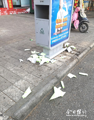 本刊消息 日前,家住五路口的王蕾打进本刊热线(6209581)称,近段时间,她发现城区不少地段被广告单“侵占”。市民收到广告单后看也不看就随手扔了,一时间广告传单满街乱飞,不仅忙坏了环卫工人,也影响市容市貌。在此,她想借助本刊平台提醒广大市民共同爱护城市环境,尊重环卫工人的劳动成果。 王蕾告诉记者,6月17日,她从明阳街逛到中心广场,短短百十来米的路,就收到了四五张广告单,这些广告单五花八门,有推销吃、穿、用的,还有卖房、旅游、健身的……有人发广告单的地方,地上就有被人随手扔掉的传单。她还看到两个20岁左右的姑娘把手上的多张宣传单随手放在垃圾桶盖子上,风一吹,这些广告单便满街乱飞。“不想要可以不用接,但接到了又随处乱扔,这种行为不仅不文明,还影响城市的环境卫生,给环卫工人增添工作量。”王蕾说道。 针对这种现像,6月18日,记者在城区进行了走访调查。临近期末,天河小学校门外,几个青年手拿厚厚一摞培训机构广告单随意散发,甚至有人干脆搬来桌椅在街边占道设台,一边接受家长的咨询,一边散发广告单,导致校门口秩序混乱,周边地上全是散落的各种广告传单。而在中心广场,晚间散步的市民更是人手一张广告单,有的看也不看随手扔掉,有的放在花坛边垫位,走时也忘记带走,休闲娱乐的广场变成了小广告的“地盘”。 负责中心广场片区环卫工作的环卫工人李仁玉提及发放传单,便特别头疼。她说,她每天都要扫大量的传单,经常“扫都扫不赢!”“要是赶上下雨,传单根本扫不起来,给自己增加了不少工作量。”李仁玉希望市民不要随手乱接乱扔广告单,尽量将其扔到垃圾箱里,共同爱护城市环境。