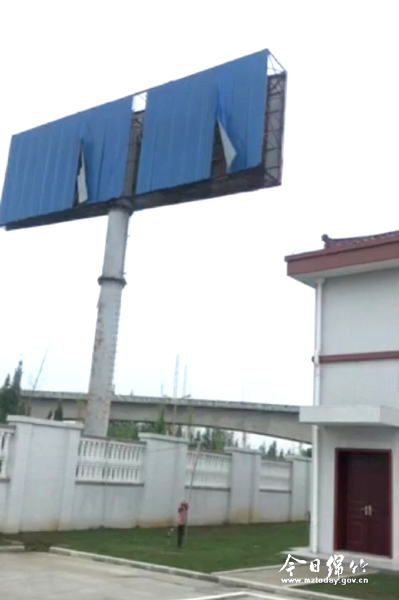 本刊消息 9月11日,我市富王粮油公司负责人王清富打进本刊热线(6209581)反映,位于成绵复线孝德入口处附近,也是自己新厂围墙旁的铁塔广告牌在秋风中摇摇欲坠,随时有脱落的危险,危及来往路人安全。他希望有关单位引起重视,及时处理,还市民一个安全的出行环境。 接到热线电话后,记者立即赶往现场。远远地就看见,在成绵复线孝德入口处右前方伫立着一座高约10余米的铁塔,铁塔上方镶嵌着两块蓝色的彩钢广告牌,彩钢广告牌已破烂不堪,在微风的吹拂下两块撕裂的钢结构条正在大幅度地左右晃动,随时都有脱落的危险。“前段时间,上面的钢结构条已经掉了一大块下来,还好当时下面没有人路过,不然后果不堪设想。”家住附近年画村的高大爷看见记者在附近采访,连忙上前对记者说道。 铁塔广告牌位于高新区,铁塔下方是富王粮油新建厂区。“我们工厂的员工宿舍就位于广告牌的正下方,正式生产后,每天进进出出经过的员工很多,广告牌上面摇摇欲坠的钢结构条犹如悬在上空的‘不定时炸弹’,时刻威胁着员工的安全。”王清富告诉记者,公司投产后有大量人员、车辆进出,如果广告牌脱落后果不堪设想。况且铁塔广告牌位于成绵复线孝德入口处,直接面向来来往往的外地游客,如果不及时加以维护,不仅存在安全隐患,也不利于绵竹城市形象的提升。 随后,记者想方设法联系到铁塔广告的业主云帆广告公司负责人高先生。高先生表示,他们每年11月份都会对铁塔广告牌进行维修加固,这个月初接到群众反映后,便着手准备材料,打算用吊车对广告牌进行修复,由于近期一直下雨所以迟迟未动工。“天晴后我们动工维修,这两天我们会在广告牌前后15米的地方设置警示标志,提醒路人注意安全。”
