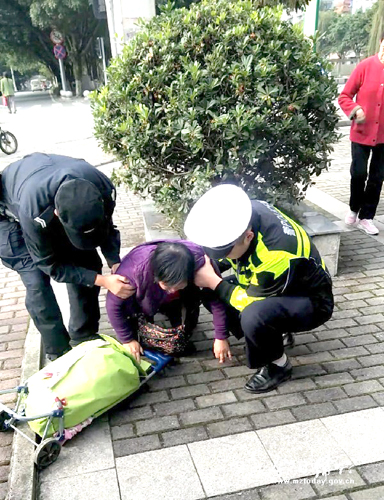 图片由交警大队提供 本刊消息 11月14日,我市城区安国桥头上演了温暖人心的一幕:一位老人突然晕倒在路边并出现呕吐,正在执勤的交警见状立即上前救助,并拨打其家属电话一同将老人送往医院进行治疗,目前,老人身体已无大碍。 当天上午9时许,交警大队城市中队民警正在安国桥头开展日常巡逻时,突然发现一名六七十岁的老婆婆晕倒在路边,民警立即上前查看情况,发现老人眼睛紧闭,处于昏迷状态。民警确认老人无外伤后,采取了急救措施,待其逐渐清醒后,两名队员将老人搀扶到路边花坛上休息。 “婆婆你没得事嘛?看你脸色不是很好?”当民警询问老人身体有何不适,需不需要送医时,婆婆连连摇头表示自己并无大碍,并称要赶着去接小孩。正当老人准备离开时,却出现不断呕吐的状况。民警不放心老人独自离开,拨打了其儿媳的电话。当老人儿媳抵达现场后,交警陪同一起将老人送往医院治疗。 “事发时周围有好多市民,但却没人敢出手,幸亏有交警同志在,让我婆婆能及时救治,转危为安!”在此,民警也提醒广大市民,上了年纪的老人出行,最好由家属陪同,以免发生意外。