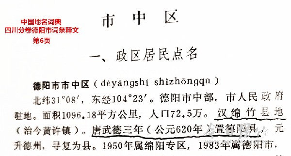 华阳国志校注卷三 蜀志259页拍照 再对比看看德阳市地方志编印的《中华人民共和国地名词典四川分卷》的德阳市词条释文第6页是怎么介绍德阳市中区的吧:“德阳市中区……市人民政府驻地……汉绵竹县地。治今黄许镇,唐武德三年(公元620年)置德阳县。”这样的史料俯拾即是,可是记者似乎根本就不知道,所以在第二段小标题黄许“绵竹城”的消失或因兵祸”这段叙述里得出更加错误的结论。