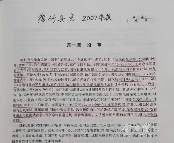 四川新闻网德阳记者站记者周鸿等10月12日在省、市几家新闻媒体发表《绵竹故城遗址》稿件,从标题上看似乎是把绵竹城前世今生搞清楚了,但由于这些记者没有查证史实,反而引起不少读者对此的误解。为了尊重历史,澄清真相,笔者本着实事求是的态度针对周鸿一文提出不同看法,敬请有识之士批评指正。 周文第一个小标题是“不在绵竹境内的绵竹故城遗址”,应当说这是一个没有古今概念的模糊标题。周文究竟是指当代或汉代“不在绵竹境内的绵竹故城遗址”?如果是指汉代,那么就错了,因为汉代绵竹县的县域范围很宽,不仅包含现在的整个绵竹区域,还包括现在的整个旌阳区(旧德阳县全部)以及安县的西部地区,都属汉代绵竹县的范围。那怎么能说绵竹故城遗址不在绵竹境内呢?如果周文是指当今绵竹故城遗址不在绵竹境内,虽然是对的,但毫无意义,这并非新闻了。早在唐代李吉甫撰《元和志》全称《元和郡县图志》中就有绵竹故城在黄许镇的记载,唐代的历史文献即已考证清楚,而不是新发现。更不能因为在黄许发掘出汉绵竹城遗址而得出今绵竹区域不属汉代绵竹辖地的结论。事实上今绵竹、德阳、黄许都只是汉代绵竹不可分割的组成部份。 为了证实笔者的观点,我们必须考察引证可靠的历史文献,见班固《汉书地理志》上:广汉郡,高帝时设郡。王莽时改名就都县,属于益州刺史部。下有十三个县:梓潼县,驰水发源于五妇山,向南流入涪水,行程五百五十里。王莽时叫子同县。汁方县,王莽时叫美信县。涪县,有孱亭。王莽时叫统睦县。雒县,雒水发源于章山,向南到新都谷流入湔水。有工官。王莽时叫吾雒县。绵竹县,绵水从紫岩山流出,向东到新都北入雒水。都尉治理。广汉县,王莽时叫广信县。葭明县,郑县,新都县,甸氐道县,白水流出境外,向东到葭明县流入汉水,经过一个郡,行程九百五十里。王菱时改名垫挝。白水县,刚氐道县,遣迷流出境外,向南到垫江流入汉水,经过两个郡,行程一千零六十九里。阴平道县。由北部都尉治理。王莽时改名壁厦题。 上引《汉书地理志》表明,汉高帝时设广汉郡所辖十三个县只有绵竹县,而没有德阳县。且进一步说明:绵水从紫岩山流出。而紫岩山即指今绵竹境内的汉旺、九龙一带的山脉、绵水则指今绵远河。他沿绵竹山区、平坝区而下,经德阳市袁家镇过黄许镇立交桥,再穿德阳城南而去。绵水即沱江上游正源。汉代绵竹县区域是随着绵远河流域形成的,他包含今绵竹全境和德阳县(今旌阳区)全境。 此外,在晋人常璩所著刘琳校注的华阳国志校注卷三 、蜀志259页原文中载:“绵竹县,刘焉初所治。绵与雒,各出稻稼,亩收三十斛,有至五十斛。旧各本皆作‘十五斛’。廖本改作‘五十斛’。是。汉时,任定祖旧各本此下有安字。廖本删。是。以儒学教,号侔洙泗。有多士,秦、杜为首族也。” 原文下有刘琳校注:“绵竹县两汉旧县,蜀、晋因、地滨绵水(今绵远河)多竹故名。辖今绵竹德阳二县及安县之西部。《元和志》卷三一,绵竹故城在唐绵竹县东五十里黄许镇。”