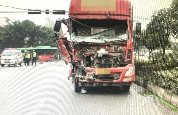 本刊消息 11月28日中午,武都场镇发生一起交通事故,一辆大货车与6路公交车相撞后,导致公交车与停放在路边的面包车再次发生碰撞,面包车司机和公交车内6名乘客不同程度受伤。目前,7名伤者已被送往医院进行救治,事故原因正在进一步调查中。 当天中午1点05分,市公安局交警大队接到群众报警电话称,武都场镇发生一起交通事故。接警后,事故中队及四中队民警立即赶往现场。到达现场后,民警一边疏散围观群众至安全区域,一边对事故现场进行隔离并展开调查。 据办案民警介绍,中午12点56分,杨某某驾驶货车从汉旺方向沿绵茂路往绵竹城区行驶。当行驶至武都场镇十字路口时,货车车头与正在左转弯的客车右侧车尾发生碰撞,客车失控后与停放在路边的面包车再次发生碰撞,导致面包车司机和公交车内6名乘客不同程度受伤。据现场照片显示,大货车车头严重受损变形,前挡风玻璃全部破碎,客车右侧车尾与面包车也不同程度受损。 车祸发生后,救护人员第一时间赶到现场,7名伤者已全部被送往医院进行治疗。周围群众告诉记者,武都场镇红绿灯十字路口因缺乏有效监管,加上部分驾驶员交通意识淡薄,时常引发交通事故。大家都希望能在该路口安装电子眼抓拍系统,对车辆进行限速,同时相关部门加大巡逻整治力度,确保群众安全出行。 目前,事故原因正在进一步调查中。(图片由交警大队提供)