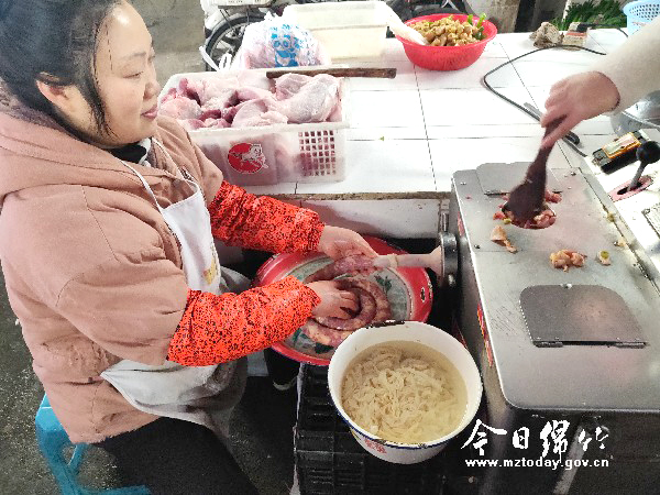 本刊消息 香肠、腊肉是四川人过年时餐桌上一道不可或缺的年味。随着农历新年的临近,香肠腊肉也到了一年一度的热销旺季。近日,记者走访市场了解到,近期灌装香肠、腌制腊肉的人络绎不绝,大街小巷陆续飘出了香味。 12月9日,记者在紫岩菜市看到,多家摊点前挂起了一串串晾好的香肠和腊肉,色香味俱全的腊味也吸引了不少市民前来购买。“这些都是我前段时间新做的,味道很不错!”摊主一边忙着称重,一边不停地向顾客介绍自己的香肠。此外,考虑到顾客需求,入冬后不少商家干脆把灌装香肠的机器搬进了市场。在城西菜市的一家香肠加工摊点前,等待加工香肠的市民已经排起了队,摊主宁福英和帮工一起分工有序地进行着切肉、绞肉、拌料、装灌香肠等。“每年这时候生意都特别好。”宁福英说,从10月中下旬起便陆续有顾客来灌香肠,近期更是得从每天早上八点忙到晚上七点左右才能收摊。 记者了解到,虽说今年猪肉价格有所上浮,但依然挡不住市民对腊味的喜爱。采访中不少市民表示,过年怎么也得准备一些腊味,餐桌上的年味才会浓郁,才有过年的仪式感。“从小吃到大,一直都很喜欢,早点装为过年做准备。”正在装香肠的市民张世富说,以前都是自家切肉、拌料等,费时又费力,现在给点加工费就行,方便多了。