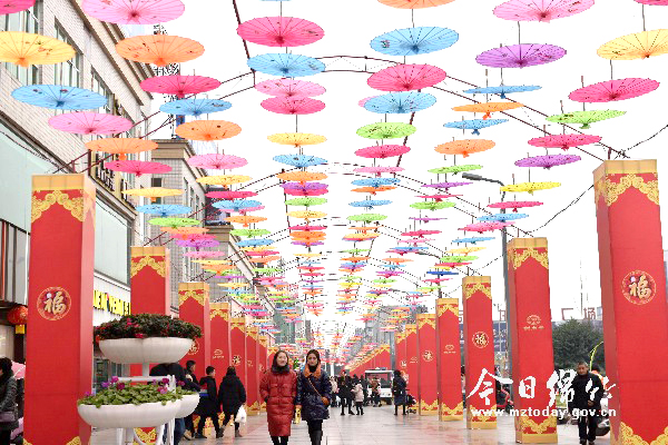 大红灯笼、花样油纸伞、美丽的鲜花……眼下,绵竹各主要街道和公园广场张灯结彩,处处弥漫着浓浓的年味,喜迎第十九届绵竹年画节和新春佳节的到来。