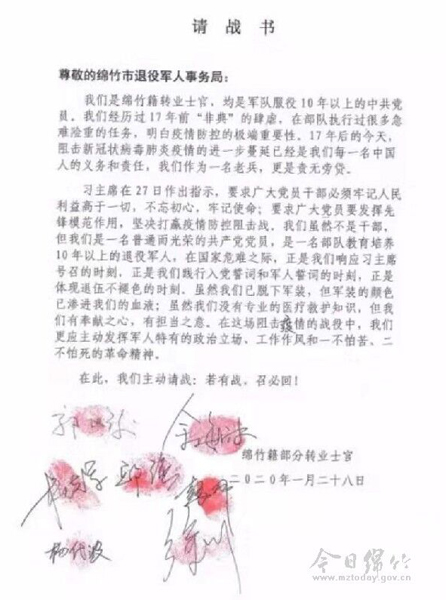 绵竹退役军人心系疫情主动提交“请战书”