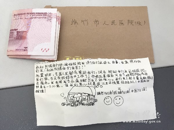 本刊消息 “阿姨,我可以把这个给您吗?”1月31日上午10时许,华西绵竹医院的门诊大厅入口处来了一对姐弟,弟弟红着脸略带羞涩地向预检分诊处门诊副护士长张清问道。张清抬头看见孩子双手托着一个牛皮纸样的信封,封面上写着“绵竹市人民医院(收)”几个大字。 张清不清楚信封里装着什么,便电话请示医院主责办,得到批准后她打开信封,里面除了信件还有两张崭新的百元人民币。信上写道:“叔叔阿姨,你们好,妈妈给我讲了这些天的事,我真想对你们说:叔叔阿姨你们辛苦了!地震那年,全国人民都在帮助我们。现在轮到我们来回报武汉了。我们家只有妈妈在工作,但她还是很高兴,因为能为社会服务。我觉得我也应该献出自己的爱心。我们买不到口罩,只能用压岁钱表示一下心意……”读着读着,张清的眼眶有些湿润,猛然抬头发现姐弟二人已转身离开,正要走出门诊大厅。 “你们叫什么名字?家住哪里?能告诉我们吗?谢谢你们的帮助!”张清急忙喊道。“你们保重身体,辛苦你们了!”姐弟并未转身,挥了挥手,快速走出了门诊,留给张清的只有两个背影。 稚嫩的笔迹,朴实的语言,却让人震撼。张清说,也许两百元钱的重量很轻,但它的情意却很重,这是对所有医护人员的最好奖励和最大鞭策。从信件稚嫩的笔迹中可以看出,这是弟弟一笔一划写下的心里话,而且他说家里只有妈妈在工作,家庭条件有限的他们只能拿出自己200元的压岁钱来表达心里最朴实的想法。我们虽然不知道这两姐弟的名字,但我们记住了这两个孩子。