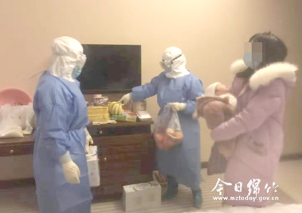 本刊消息 “笃笃笃……”2月7日早晨7点多,产妇赵某的房门被轻轻敲响,穿着白色防护服的“亲人”端着热气腾腾的早餐走了进来,轻轻地放在了桌子上。“昨晚休息得好吗?这是刚煮好的鸡蛋和小米粥,快来趁热吃。”此时,刚满30天的小星星(化名)躺在妈妈身边正睡得香甜。 产妇在观察点享受“特护”待遇 这些“亲人”并不是产妇赵某的家人,而是在我市某集中医学观察点服务的市中医医院医护人员。2月3日,因家中亲人被确诊为新型冠状病毒感染的肺炎病例,作为密切接触者,赵某一家人需要进行集中医学观察。然而这时赵某刚生产完,带着20多天的婴儿,小俩口都有些不知所措。 一住进“临时的家”后,赵某的顾虑顿时打消了,她感受到了医护人员如亲人般的温暖。“你就好好在这里坐月子,需要啥说一声就行,别怕,我们都是你的‘月嫂’。”原来,得知赵某母子即将到来,市中医医院的医护人员自发捐款近800元,买来了取暖器、牛奶、小米、水果等适合产妇进补的食物。就连新生儿的奶粉、尿不湿、纸巾等也准备得妥妥当当。产妇入住的房间需要消毒,可又不能使用含氯消毒液,怎么办呢?医护人员每天将软布浸泡酒精后,对房间的桌椅、床柜等一一擦拭消毒。为了保证产妇营养,他们还每天变着花样给赵某炖鸡汤、熬粥等,为其量身“定制”月子餐。 “今天就聊这些,你快关上窗户休息,或者追剧刷抖音嘛,你们年轻人最喜欢了,记得别玩太久了。”微信聊天时感觉赵某情绪有些低落,市中医医院副院长刘辉干脆站在楼下,仰着脖子和赵某隔窗“畅聊”,诙谐幽默的言语、暖心体贴的叮嘱,赵某内心郁闷的情绪顿时一扫而空。 隔离病毒不能隔离爱 隔离病毒,不能隔离爱,在绵竹的集中医学观察点,一幕幕暖心的画面正在上演。 “吃住都挺好的,就是成天待在房间里,这把老骨头都快生锈了。”由于密切接触了某确诊病例,村民刘某需要进行集中医学观察。没住几天,每天溜达惯了的刘某就感觉浑身不自在。“来,我教你做个操,运动运动。”市第二人民医院医护人员亲自示范起健康操。跟着医护人员的动作,刘某点点头、踢踢腿、甩甩肩,没一会就学会了,自己开始在房间里边溜达边运动。“还别说,活动下筋骨感觉确实舒服多了。” 除了每天对入住人员进行医学临床症状检测外,市第二人民医院医护人员还变身“外卖小哥”,为其提供贴心的日常服务。“我们一早就建立了微信服务群,除了通过微信嘘寒问暖,还开通了微信‘代购’、送货上门服务,帮助被隔离人员购买生活必需品。”渐渐地,每位医学观察人员都感受到了“大家”的温暖,变得越来越开朗。(图片由集中医学观察点提供)