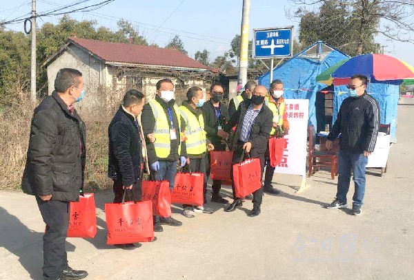 本刊消息 2月15日下午,我市气温大幅下降,而战斗在各卡点的执勤人员依然在寒风中为大家守护平安。 位于我市玉泉镇的凯歌羽绒制衣有限公司老板张生凯看在眼里,急在心里。次日下午,他将10件厚型羽绒服送到玉泉派出所,随后又为玉泉镇捐赠160件厚型羽绒服,用于该镇各村、社区卡点执勤人员御寒保暖,感谢他们的辛苦付出。