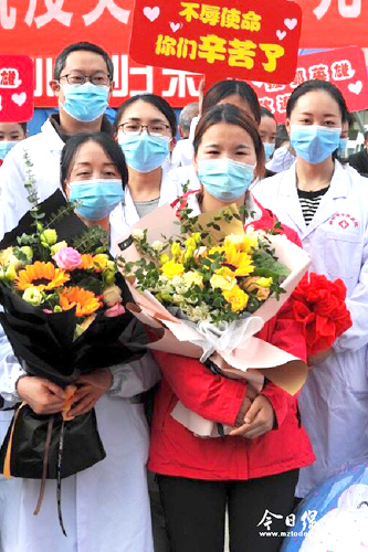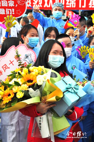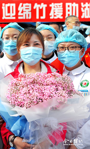 “姚红蕾,你终于回来啦!看,你喜欢的奶茶我们已经买来了!”队员姚红蕾刚到华西绵竹医院院前广场,科室同事魏燚一个箭步冲到跟前,给了她一个大大的拥抱。随后,鲜花、礼盒、奶茶等一股脑塞到姚红蕾手中,这个95后小姑娘顿时被同事们的热情淹没。 “这些日子,我奔赴前线,原先的工作都是同事在帮着做,真的很感谢她们。”姚红蕾说,无论是前往武汉,还是留守本地医院,面对疫情,所有医护人员因为责任都选择了坚守。“出发前我想喝奶茶,结果太匆忙没能喝到。”抵达武汉后,姚红蕾还跟同事逗趣,称希望用奶茶迎接她的归来,没想到这个愿望成真了。 回到绵竹,受到家乡人民隆重热烈的迎接,也是姚红蕾等队员们没有想到的。“其实这次去武汉,我们干的是自己的本职工作,没想到市委市政府这么重视,安排这么高规格的迎接仪式,令我们太感动了!”姚红蕾说,不仅如此,绵竹本地媒体对他们在湖北武汉工作的连续报道也是他们工作的动力之一,她将把所有有关报道的《今日绵竹》珍藏起来,留作对这段特殊岁月的纪念,也将把对家乡人民的感恩延续到工作中,踏踏实实地干好本职工作。 李元洁:回到绵竹,我的眼泪就没停过