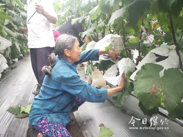 早上6点,天刚微明,家住九龙镇黄金村十组的肖絮芳大娘早早起了床,她快速地吃完早饭,戴上帽子,拿起剪刀,挎上铁桶,便一刻不敢耽误地出了门。在离家500米处的一座葡萄园内,工人们早已热闹地忙活开来,肖絮芳赶紧加入其中。 葡萄藤半人高,上面缀满了累累果实,瘦小的肖絮芳只能蹲着身体,弯着腰在茂密的葡萄叶里来回穿梭,寻找品质较好的葡萄进行采摘。只见她低着头,从底部快速撕破每串葡萄的袋子,再熟练地剪下一串,小心翼翼地放进身旁的铁桶内。常常半天下来,她累得连腰都直不起来。 上午10点半,火辣辣的太阳挂在天空,室外温度已经超过30度。阳光直射、环境密闭、空气不流通,大热天的葡萄园里很容易让人中暑。肖絮芳和工友们要在这样“火炉”般的环境里,赶在下午两点前把顾客要的2000斤葡萄全部摘完装车。经过暴晒的葡萄有些烫手,肖絮芳却仿佛全然不觉,只顾埋头挑选、采摘,汗水顺着她的脸颊往下滑,挂在脖子上的汗巾已经浸湿了一圈,衣服也被汗水紧紧地粘在背上。上午11点半,第一批葡萄采摘完毕,在过秤装车的间隙,肖絮芳才有空拿出水杯,坐在田埂边喝了一口水。 今年68岁的肖絮芳是村里有名的“拼命老人”,本该颐养天年的她却总是在家里坐不住,不是顶着烈日在葡萄园里忙碌采摘,就是冒着寒风在蔬菜基地里收割蔬菜。家人和邻居总是担心她累坏身体,常常劝她在家休息,她却不以为意,仍然“我行我素”地奔忙在田间地头。“面朝黄土背朝天一辈子,才是农民的本分。”肖絮芳说道。 唐妮 文/图 责编:周静