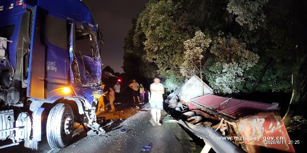 8月11日晚上9点左右,绵汉路天齐小学路段,一辆直行拖挂车与另一转弯拖挂车发生碰撞,转弯拖挂车因强烈撞击,撞翻路边护栏,发生侧翻,车辆左侧受损。车内人员受轻微伤。