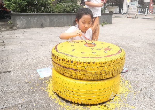 本刊消息 调墨、描框、涂色……8月21日上午,在剑南街道盛世华章小区门口,来自该小区的10余位小朋友在家长的指导下正在进行废弃轮胎的涂鸦绘制。不一会儿时间,恐龙、皮卡丘、卡通狗狗、河豚、熊猫、小猪佩奇等图案便活灵活现地出现在轮胎上,让人眼前一亮。 该小区物业经理何春春告诉记者,为美化小区环境,开拓小朋友们的想象力和创造力,物业特别组织了此次夏日童乐荟涂鸦活动。活动中,小朋友们在废弃轮胎上涂底色、绘图案,充分发挥自己的想象力和绘画才能,用了一上午的时间便协力完成了38个轮胎的涂鸦工作,为小区美化做出了自己的一份力量。 记者看到,这些轮胎画让小区居民欣喜不已,不少居民驻足欣赏,有的居民还拿出手机拍照片发朋友圈,引得众多朋友点赞。