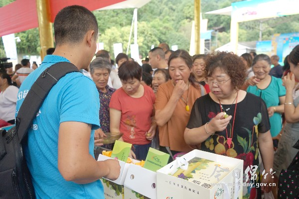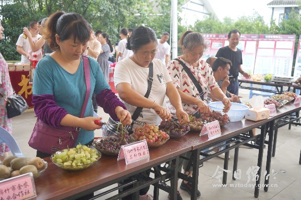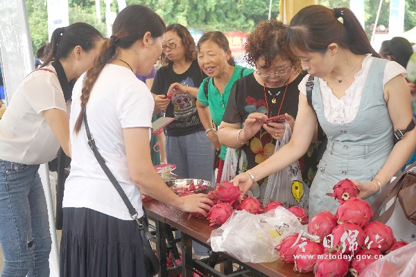 本刊消息 9月8日,在如画的沿山美景中,美妙的歌声、精彩的表演、香甜的瓜果吸引了市内外的游客纷至沓来,来自汉旺、广济、九龙、孝德、剑南街道等镇(街道)的近20余家参展农户纷纷将自家新鲜的水果摆上展台,期待着远道而来的游客与他们共享瓜果飘香的丰收喜悦。 “绵竹沿山的水果是出了名的,我们专程赶过来参加今天的赏果节,准备带点梨儿、火龙果、猕猴桃回去。”游客们一边尽情享受山边怡人的风景,一边在展销区四处寻觅心仪的绿色果品。 “新鲜的雪梨,口味香甜,皮薄汁多,快来挑快来选!”在果农王绍余的摊前,围满了前来挑选的游客,看到生意如此红火,他难掩笑意。王绍余是广济镇天平村一组的村民,家里种有2亩多地的梨树和2亩核桃树,每年能收获梨子和核桃共3400多斤。“这段时间是丰收的季节,也是我最开心的时候,今年梨子和核桃卖完算下来能有一万多元的收入。”王绍余开心地说,守在家门口就能将果子销出去,全靠沿山旅游产业的发展和每年举办的赏果节,不仅让市民对本地水果有了更直观的了解,更给沿山果农搭建了一个展销平台,拓宽了水果的销售渠道。 在展销台的一旁,记者发现了几样别致的“果品”,他们便是火龙果、百香果系列产品。“这个是火龙果花,全花可生食或加工,香甜味美;这个是我们做的百香果蜂蜜茶,清甜可口……”来自绵竹市自然农耕生态种植专业合作社的参展业主熊然是第一次参加赏果节活动,她热情地向游客们介绍着产品,展台上摆放的火龙果、百香果以及各类衍生产品,吸引了不少游客好奇的目光,大家在感叹本地果品越来越丰富的同时争相购买尝“稀奇”。