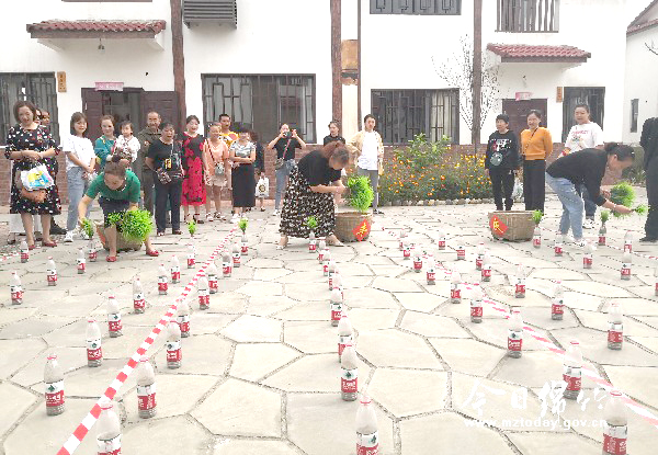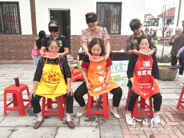 本刊消息 9月18日上午,随着德阳市2020年农民丰收节在孝德镇年俗村启动,一场乡村游园活动也在这里热闹开展。 “加油、加油……”随着围观群众一阵阵的加油声,“插秧子”比赛激烈进行。在分成三组的赛道里,三位选手正在快速地把一根根“秧苗”插在赛道里的一个个矿泉水瓶里,插完“秧苗”后再迅速“回收”到箩筐里,在选手们的手忙脚乱中,大家感受到了“比赛”带来的乐趣。另一边,敲响锣、吃瓜大赛现场也传来一阵阵欢笑声。在吃瓜大赛中,三位选手分坐一起,分别由一名蒙着眼睛的选手拿着西瓜喂到嘴里,看谁先吃完为赢。看似简单的比赛却也藏着难度,“看,都喂到鼻子里了!”“要不得,要不得,这样哪里吃得到哦!”敲响锣则是考验人的方向感,参赛人蒙上眼睛先在原地转三圈,然后朝着印象里的锣鼓方向走去,敲响锣鼓者为赢。看着很多在原地转了圈后找不着北的参赛人,大伙不由地哈哈大笑。 活动中,各类喜闻乐见的乡村游园活动受到了广大群众的喜爱,主办方还为每位参与者准备了小礼物,参赛的群众玩得不亦乐乎,气氛十分热烈。
