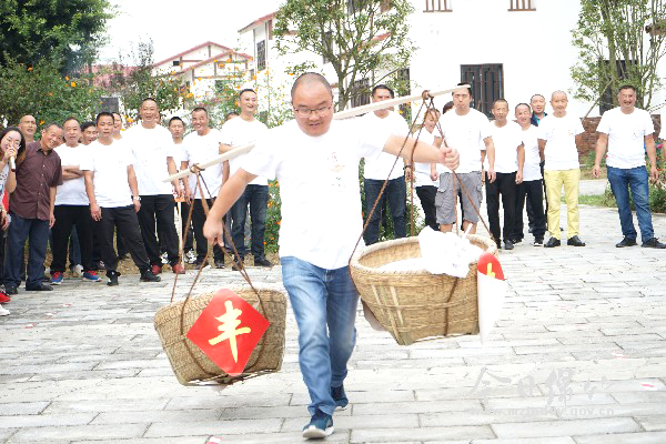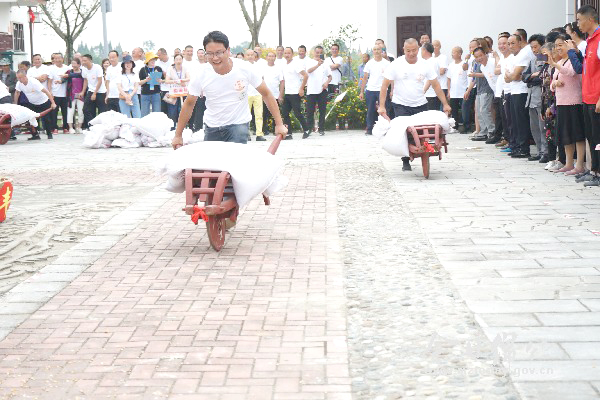 本刊消息 9月18日上午,孝德镇年俗村广场上人头攒动,欢呼声、呐喊声此起彼伏,一场“农”味十足的田园运动会正在这里举行,吸引了孝德镇的14个代表队共84名运动员参加。推鸡公车、挑担子、剥玉米和拔河等特色活动,让现场群众乐开了怀。 “快跑、快跑,追上了!”在推鸡公车项目中,各队分列各自的赛道,随着裁判一声令下,开始推动负重一袋粮食的鸡公车向前奔跑。由于鸡公车是独轮,稍不注意便会侧翻,“啦啦队”比“运动员”还紧张,加油助威声震耳欲聋。挑担子项目更是引来一阵阵哄笑,一位参赛者在慌不择路的奔跑中不慎将担子里的粮食翻倒在地,引来现场一片尖叫和叹息声。活动现场,参赛者们你追我赶,紧张刺激,高潮迭起,大家在极具趣味性的项目中体验传统农耕文化的独特魅力。 “在秋收的季节里参加这次田园运动会,我感到非常高兴。活动不仅让大家锻炼了身体,增强了体质,也一同分享了收获的喜悦,增近了邻里情谊。”来自桐麻村的参赛代表张飞告诉记者,通过一系列反映农民日常劳作的体育活动,更好地展现了新时代农民积极健康的精神面貌以及对美好生活的向往,希望在今后的丰收节里能举办更多适合农民的活动。 据孝德镇有关负责人介绍,本次运动会将日常劳作融入游戏中,更加贴近现代农业生产生活,有利于繁荣农民文化体育活动,促进健身、健康元素融入乡风文明,助力乡村振兴发展。