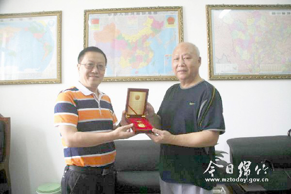 ▲2016年7月21日,绵竹著名抗日将领夏骑风之子夏以刚(右一)接受抗战胜利70周年纪念章