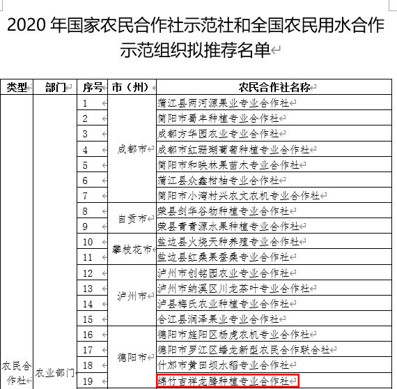 2020年国家农民合作社示范社和全国农民用水合作示范组织名单公示 我市一家农民合作社上榜