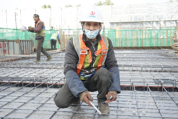 走进碧桂园项目施工现场,塔吊林立,机械轰鸣,吊运中的钢筋纵横往来,建筑工人们穿梭于脚手架之间。在三楼盖梁上,记者见到了正在进行钢筋绑扎施工的杨明。由于楼顶四周没有遮挡,刺骨寒风迎面扑来,他轻轻哈了口气,搓搓双手,随即又投入工作。只见他右手拿着扎钩,左手拿着扎丝,双手灵巧扭动,只用了三四秒,一根20厘米长的扎丝便把钢筋牢牢固定。而这样的扎丝工序,他一天要完成三千余个。 今年51岁的杨明,是资阳市乐至县人。今年10月,他和妻子一起来到绵竹,从事钢筋捆扎工作。只要不是极端恶劣的天气,他们都会按时出工。“先搭钢筋大梁,再绑平板,我们只要一干起活来双手便闲不下来,也就不觉得冷了。”杨明说,前几天绵竹普降小雪,早晨上工时盖梁上积了一层薄雪,为了保证工程顺利进行,他和工友只能先用手抹开积雪,再小心翼翼的扎好钢丝,等到中午休息时,他的双手已经冻得微微僵硬。 扎丝固定是一个灵巧活儿,为了不影响手的灵活度和扎丝固定的速度,即使是在冬天,杨明大多数时候只戴着橡胶手套工作。“早上特别冷时,我会在橡胶手套里面戴一层薄棉手套,等完成钢筋骨架搭建,身体逐渐暖和后再脱掉里面那层。”脱下手套后,记者看到,杨明粗糙干瘦的双手上已遍布冻疮留下的红痕和被钢丝扎破的伤疤。 春节即将到来,杨明的女儿打来好几个电话,询问父母何时回家,杨明却始终不能确定归期,因为手里的工程迟迟未能完结。“虽然天气很冷,但我们也要把工作干好,保质保量,才能安心回家与家人团聚。”朴素的杨明述说着平凡的愿望。 泥工李秀辉:干起活来就不冷了