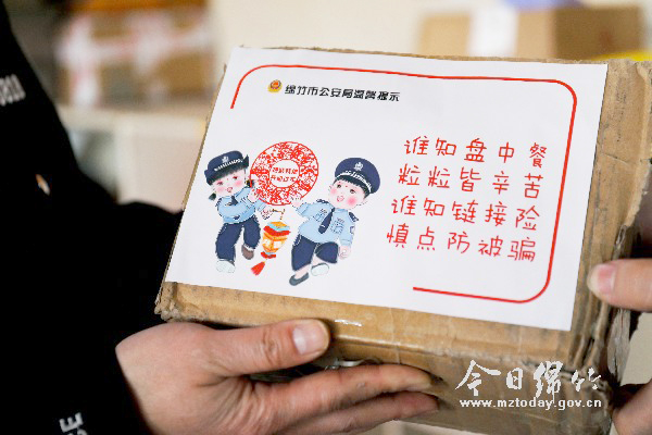 本刊消息 “网络陷阱别踩、网络刷单勿信、网聊客服多辨、网银支付莫慌”“谁知盘中餐粒粒皆辛苦,谁知链接险慎点防被骗”……近日,贴着生动有趣的绵竹警察年画反诈贴纸,随着快递包裹送到了市民手中,原来这是市公安局联合各物流公司共同打造的反诈宣传新模式。