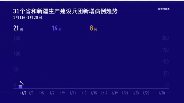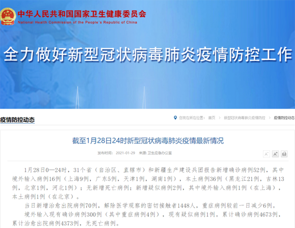 1月28日0—24时,31个省(自治区、直辖市)和新疆生产建设兵团报告新增确诊病例52例,其中境外输入病例16例(上海9例,广东5例,天津1例,湖南1例),本土病例36例(黑龙江21例,吉林13例,北京1例,河北1例);无新增死亡病例;新增疑似病例2例,其中境外输入病例1例(在上海),本土病例1例(在北京)。 当日新增治愈出院病例70例,解除医学观察的密切接触者1448人,重症病例较前一日减少6例。 境外输入现有确诊病例300例(其中重症病例4例),现有疑似病例1例。累计确诊病例4673例,累计治愈出院病例4373例,无死亡病例。 截至1月28日24时,据31个省(自治区、直辖市)和新疆生产建设兵团报告,现有确诊病例1802例(其中重症病例99例),累计治愈出院病例82940例,累计死亡病例4636例,累计报告确诊病例89378例,现有疑似病例2例。累计追踪到密切接触者963237人,尚在医学观察的密切接触者38876人。 31个省(自治区、直辖市)和新疆生产建设兵团报告新增无症状感染者42例(境外输入19例);当日转为确诊病例12例(境外输入1例);当日解除医学观察22例(境外输入13例);尚在医学观察无症状感染者996例(境外输入293例)。 累计收到港澳台地区通报确诊病例11263例。其中,香港特别行政区10321例(出院9239例,死亡177例),澳门特别行政区47例(出院46例),台湾地区895例(出院809例,死亡7例)。