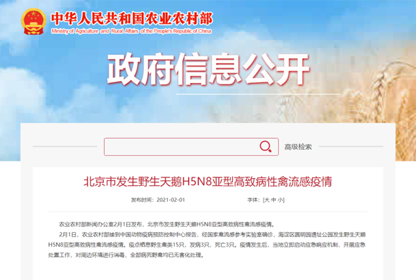 农业农村部新闻办公室2月1日发布,北京市发生野生天鹅H5N8亚型高致病性禽流感疫情。 2月1日,农业农村部接到中国动物疫病预防控制中心报告,经国家禽流感参考实验室确诊,海淀区圆明园遗址公园发生野生天鹅H5N8亚型高致病性禽流感疫情。疫点栖息野生禽类15只,发病3只,死亡3只。疫情发生后,当地立即启动应急响应机制,开展应急处置工作,对周边环境进行消毒,全部病死野禽均已无害化处理。