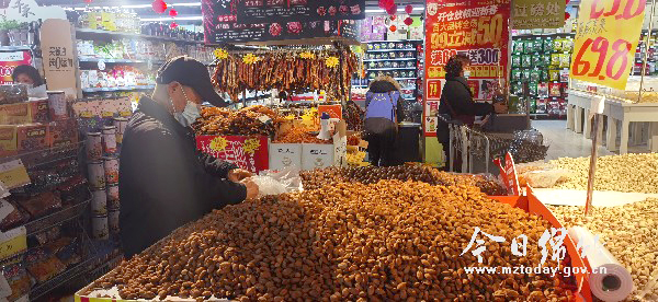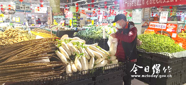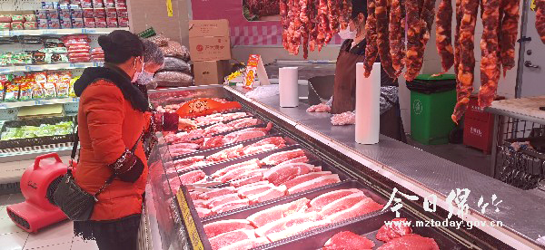 同样,在位于市区中心广场的尚品德隆以及乐易隆超市里,土豆、大白菜、青菜等市民常买的蔬菜供应充足,其他水果、肉类等食品售卖也十分火热。在生鲜区,前来购物的市民王怡购买了10斤猪后腿肉。她告诉记者,“以为临近过节,肉类、蔬菜价格会上涨,但实际看来并没有多大波动,超市里商品很丰富,出售的肉、蛋、菜等商品不仅价格实惠而且新鲜。” 市商务和经济合作局商务管理股股长何浩南告诉记者,为满足广大人民群众节日消费需求,确保节日市场商品品种丰富、供应充足、质优价稳,该局切实加强生活必需品市场应急保供工作。一是强化生活必需品市场运行监测,二是督促重点保供企业加大商品储备,三是联保联动、落实生产加工企业确保供销对接顺畅,四是组织城乡配送人员开展核酸检测和疫苗接种,保障配送安全。 目前,全市生活必需品市场储备丰富、供应充足,价格趋于平稳。除此之外,全市各超市春节期间均正常营业,不打烊,保证春节期间货品供应。