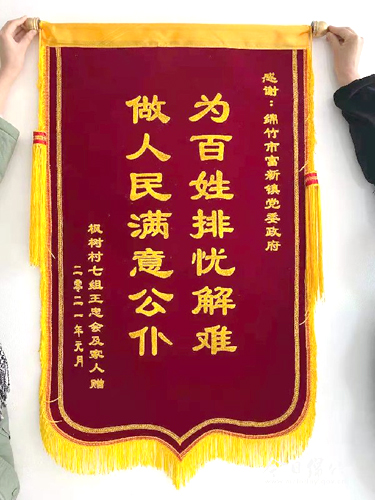 近日,富新镇枫树村七组一位村民将一面印有“为百姓排忧解难,做人民满意公仆”的锦旗送到富新镇党委政府。原来,1月21日,该村民因家中老人走失,求助富新镇党委政府,工作人员通过“雪亮工程”细心找到老人行动轨迹,并将老人送回家中。