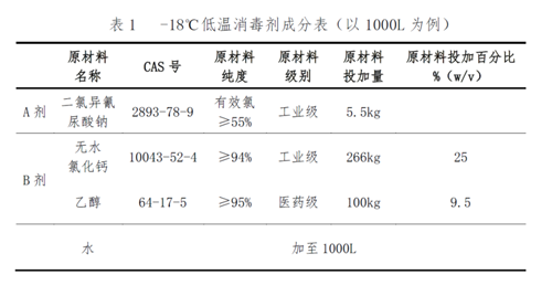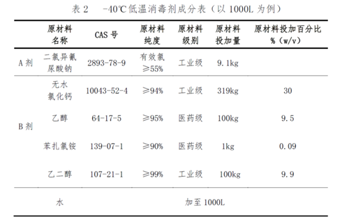 为进一步做好当前疫情防控工作,解决我国低温消毒难题,中国疾控中心按照国务院联防联控机制和国家卫生健康委党组部署和要求,自2020年6月17日启动了低温消毒新技术研究。基于技术可行、安全可靠、应用便捷、成本经济等方面考虑,历经5个多月的反复探索和研究,从几十种配方中筛选出两种低温消毒剂配方,并完成了实验室和现场消毒效果评价。2021年1月在黑龙江绥芬河市和山东青岛市紧急开展了应用试点,结果表明:研发的低温消毒剂生产工艺简单,原料成本较低,在低温下消毒效果可靠,可有效解决北方高寒地区低温环境和冷冻物品外包装的消毒难题。 现将两种含氯低温消毒剂相关信息公布如下: 一、低温消毒剂成分和剂型 (一)-18℃低温消毒剂 1.主要成分:包括二氯异氰尿酸钠、氯化钙和乙醇。现场使用时,-18℃低温消毒剂中有效氯浓度为0.3%(3000mg/L),无水氯化钙的含量为25%,乙醇的含量为9.5%。 2.剂型:二元包装,粉剂和液体。A剂为二氯异氰尿酸钠粉剂,B剂是氯化钙和乙醇的混合溶液。 (二)-40℃低温消毒剂 1.主要成分:包括二氯异氰尿酸钠、氯化钙、乙醇、乙二醇和苯扎氯铵。现场使用时,-40℃低温消毒剂中有效氯浓度为0.5%(5000mg/L),无水氯化钙的含量为30%,乙醇9.5%,乙二醇9.9%,苯扎氯铵0.09%。 2.剂型:二元包装,粉剂和液体。A剂为二氯异氰尿酸钠粉剂;B剂是氯化钙、乙醇、乙二醇和苯扎氯铵的混合溶液。 二、低温消毒剂使用范围和方法 (一)使用范围 -18℃低温消毒剂适用于-18℃及以上低温环境和物品外包装表面消毒;-40℃低温消毒剂适用于-40℃及以上低温环境和物品外包装表面消毒。 (二)使用方法 1. 喷洒消毒:与消毒设备配套使用,喷洒量约200~300mL/m2,确保低温消毒剂足量全覆盖消毒对象,消毒作用10min。 2. 浸泡消毒:直接放入低温消毒剂中,全部浸没,消毒作用10min。 3. 擦拭消毒:确保低温消毒剂足量覆盖消毒对象,消毒作用10min。 三、生产和上市要求 (一)原料和配制过程是生产合格的关键,加强生产过程中的质量控制,把好原料质量关。严格按照配方要求,确保低温消毒剂高质低价,详见表1和表2。 (二)生产时,按照成分表进行配比,先将氯化钙溶于水,充分溶解后过滤,再加入乙醇(或乙醇、乙二醇、苯扎氯铵),充分搅拌、混匀、过滤,形成液体B剂。直接分装二氯异氰尿酸钠,即为粉剂A剂。 (三)低温消毒剂上市前,应按照国家有关要求做好产品卫生安全评价并备案。