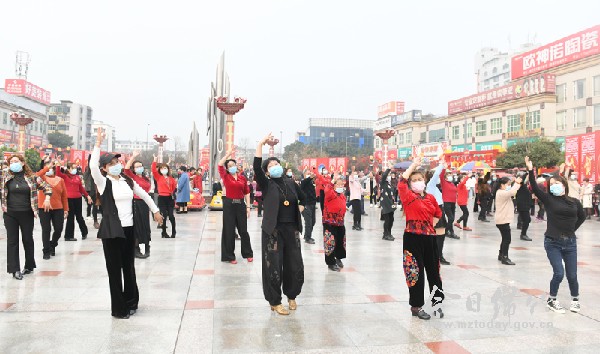2月12日,市民在绵竹市中心广场跳广场舞。