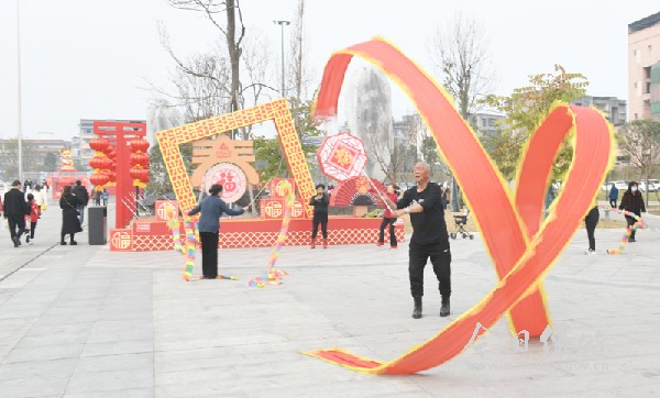 2月12日,市民在绵竹市中心广场舞动彩带龙。