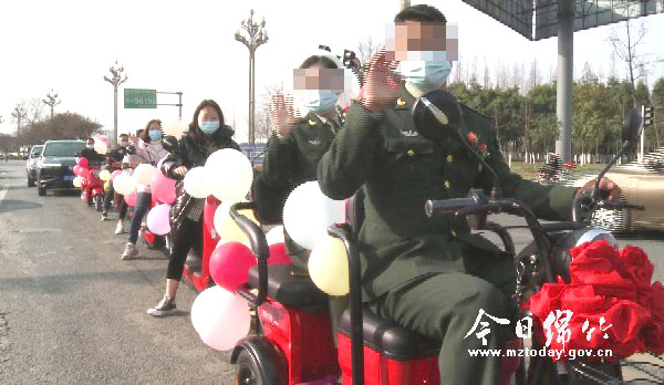据悉,新郎新娘在部队相识、相知、相爱,甜蜜的爱情经过各种历程,终于在五年后修成正果。当天,新郎一行早早地来到新娘家接新娘,电动车上的大红花看着格外漂亮。“这样的结婚方式很好啊,低碳环保还很有个性!”很多市民对这样的时尚环保婚礼表示认可和赞同。 记者了解到,新郎新娘都希望举行一场特别的婚礼,作为军人,他们以身作则,提倡节俭绿色出行。由于疫情的原因,他们决定一切从简,尽量减少参加婚礼的人数。虽然少了一些闹热,但是爱情的喜悦挡不住新人脸上的幸福笑容。