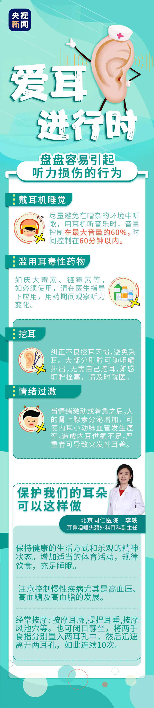 今天是3月3日全国爱耳日 根据世界卫生组织公布的数据 全球大约有4.66亿人患有残疾性听力损失 有11亿年龄在12至35岁之间的年轻人 由于暴露在娱乐环境中的噪声 面临听力损失的风险 除了长时间接触噪声 生活中还有哪些不良习惯损伤听力 央视新闻特邀 首都医科大学附属北京同仁医院 耳鼻咽喉头颈外科耳科 李轶医生 盘盘生活中 容易引起听力损伤的行为 |爱耳进行时 一起来看看|