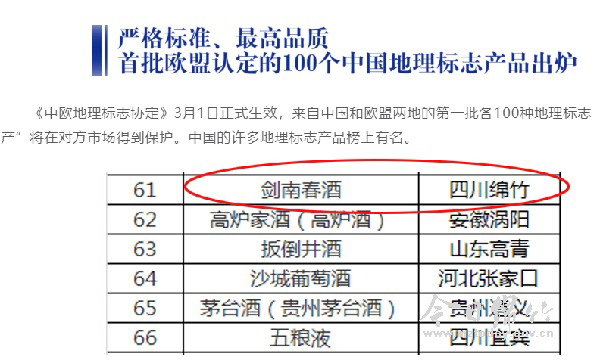 绵竹地理标志“剑南春酒”获得欧盟官方认证保护