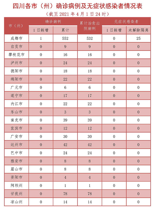 记者4月2日从四川省卫健委获悉,4月1日0-24时,四川新增新型冠状病毒肺炎确诊病例1例(境外输入,为3月24日自柬埔寨乘机抵蓉,4月1日确诊),新增治愈出院病例2例,无新增疑似病例,无新增死亡病例。 截至4月1日24时,全省累计报告新型冠状病毒肺炎确诊病例949例(其中境外输入395例),累计治愈出院929例,死亡3例,目前在院隔离治疗17例,377人尚在接受医学观察。 4月1日0-24时,全省无新增无症状感染者,当日转为确诊病例0例,当日解除集中隔离医学观察0例。尚在集中隔离医学观察25例(均为境外输入)。 (确诊病例具体情况由相关市<州>卫生健康委进行通报) 全省183个县(市、区)全部为低风险区。