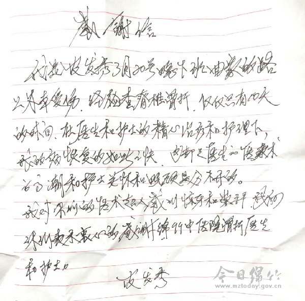 原来,半个月前,皮婆婆因不慎跌倒来到市中医医院就诊,以“唇面部、左小腿等多处皮肤擦伤,腰椎压缩性骨折”收入骨伤科住院部。入院后,骨伤科主任伍启军及主管医师杨小伟详细了解了皮婆婆的情况,为其制定了适宜的治疗及康复锻炼计划。后在骨伤科全体医护人员的共同努力下,皮婆婆病情逐渐好转,不久便活动自如,人也变得有精神了。 “刚入院时,我自己根本没办法翻身,小便、吃饭全部需要人帮忙,真的很难受。我以为要在床上躺一两个月呢,但没有想到,居然在这么短的时间内就康复了,非常感谢骨伤科的医护人员。”皮婆婆说,现在治疗虽然告一段落了,但在住院期间,医护人员对工作的一丝不苟,对患者的和蔼可亲自己都看在眼里,很是感动。一直想表达一下感谢,但不知道该用什么方法合适,考虑了很久,还是决定自己亲手写下这封感谢信。 伍启军表示,一封小小的感谢信,对于患者来说可能还不足以完全表达出内心的感激之情。但对医护人员来说,患者的认可和满意就是工作中最大的收获,同时也是一份最珍贵的礼物! (图由市中医医院提供)